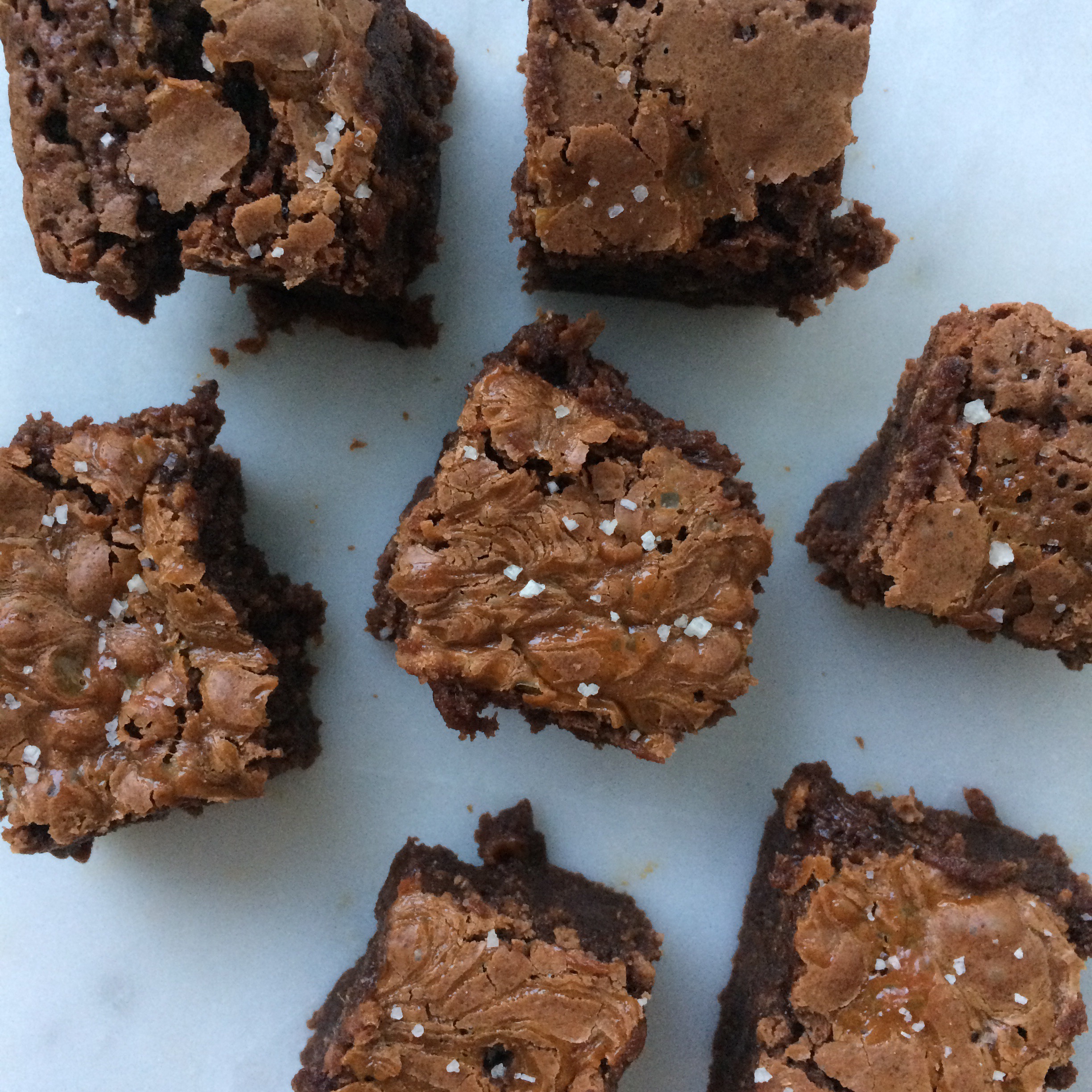 Bake for 30 minutes until the edges are set and puffed and a toothpick in the middle comes out with no batter (crumbs are fine). Sprinkle with sea salt and allow to cool slightly before cutting.
