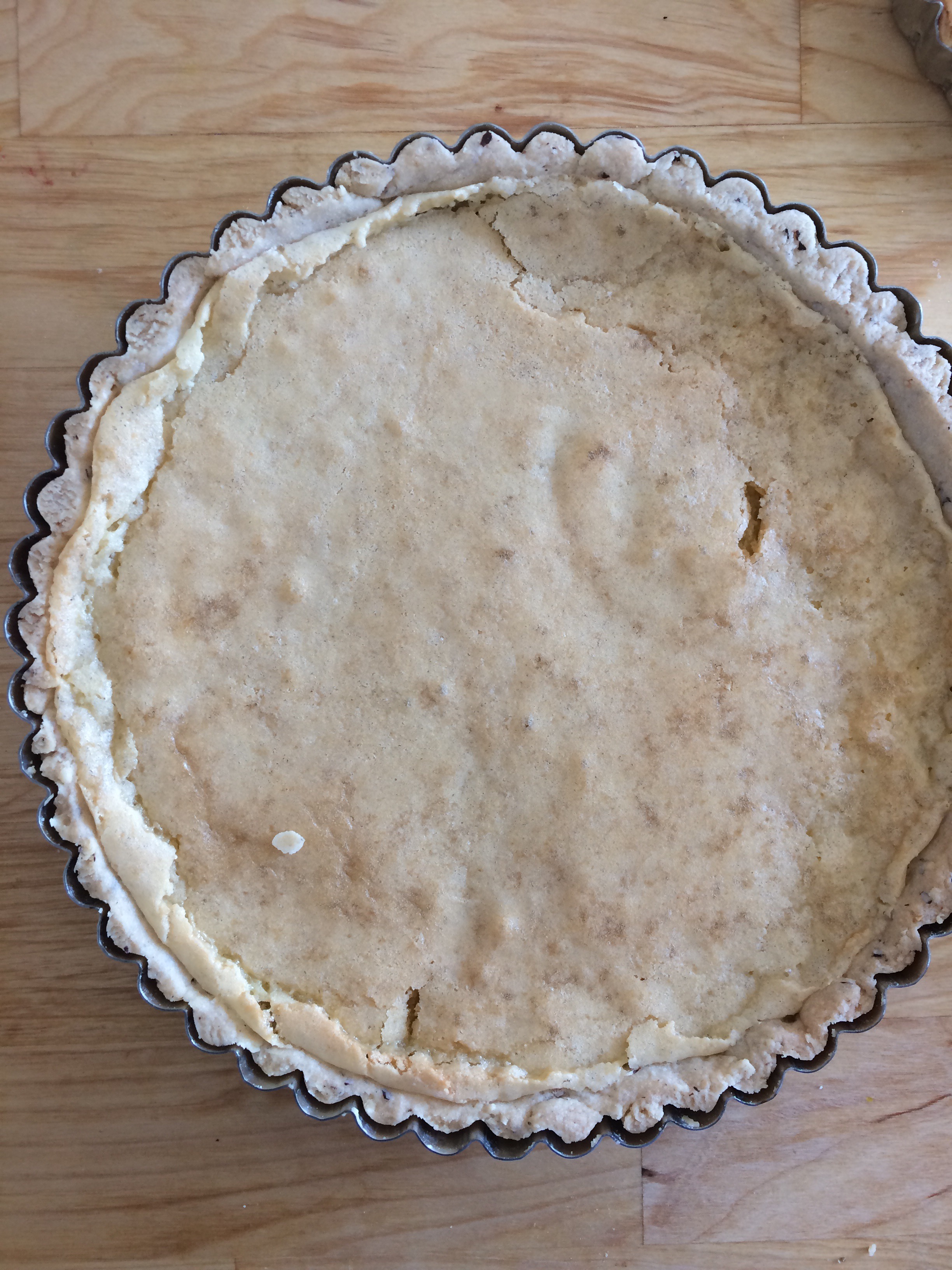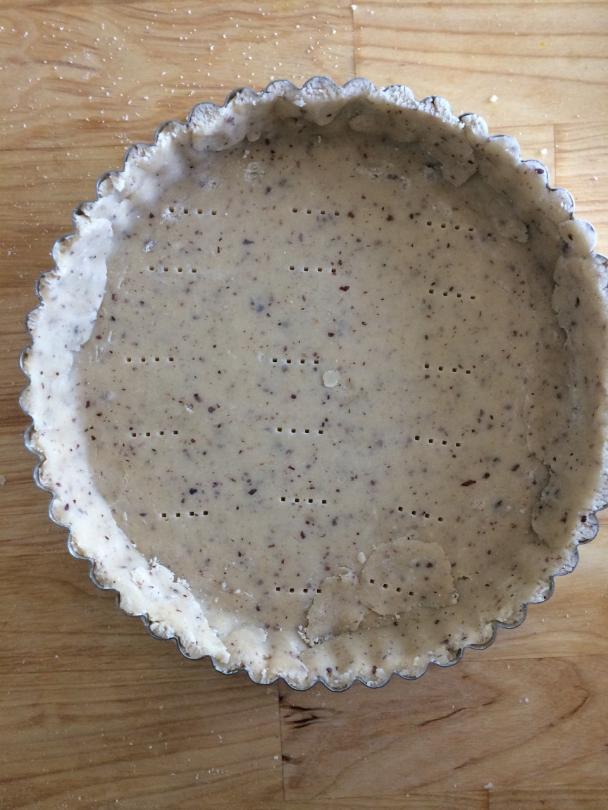 Remove from fridge and on a floured surface, roll into a 10.5 inch circle. Gently roll the dough onto a lightly floured rolling pin and unravel onto a lightly greased 8-9 inch tart pan. This method ensures that the dough doesn’t break. Press dough into the tart pan and refrigerate for 1 hour.