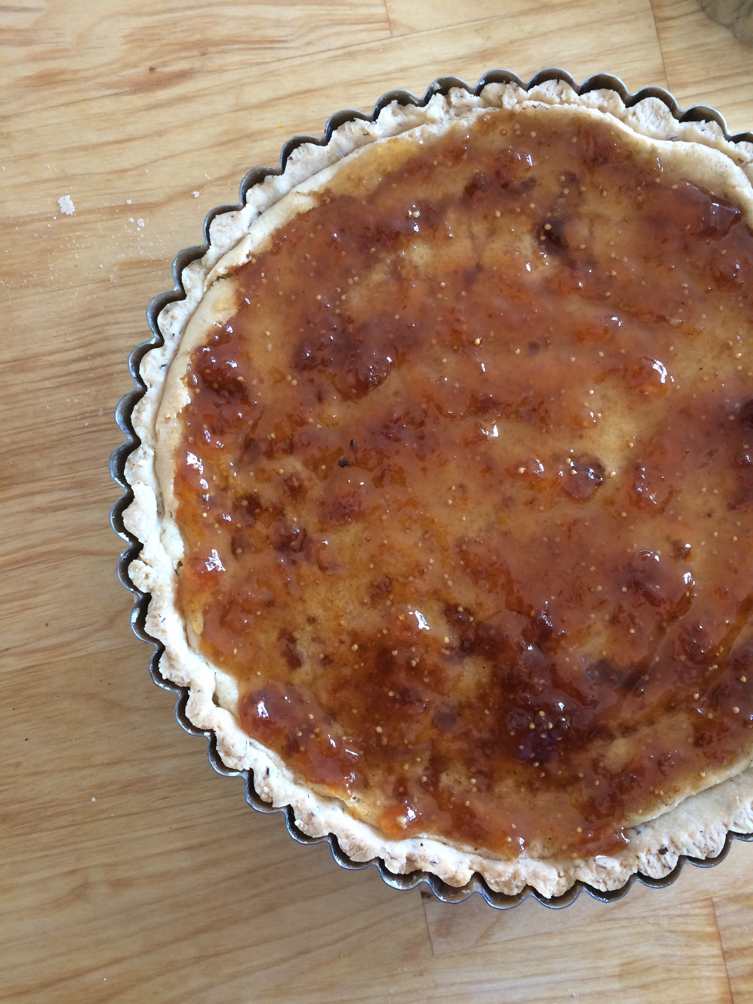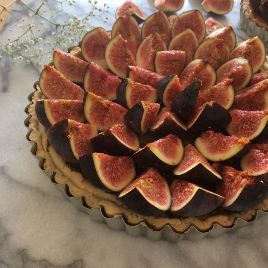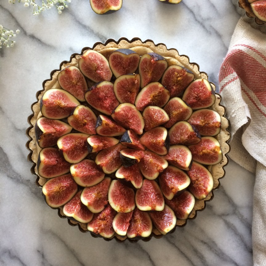 Once cool, spread a thin, even layer of fig jam over the filling. Cut stems off figs and slice into quarters. Arrange slices in concentric circles, starting from the outside, with the cut stem down. The slices should tilt upwards. Refrigerate until serving.
