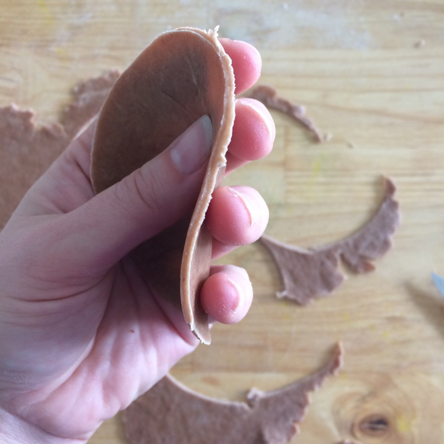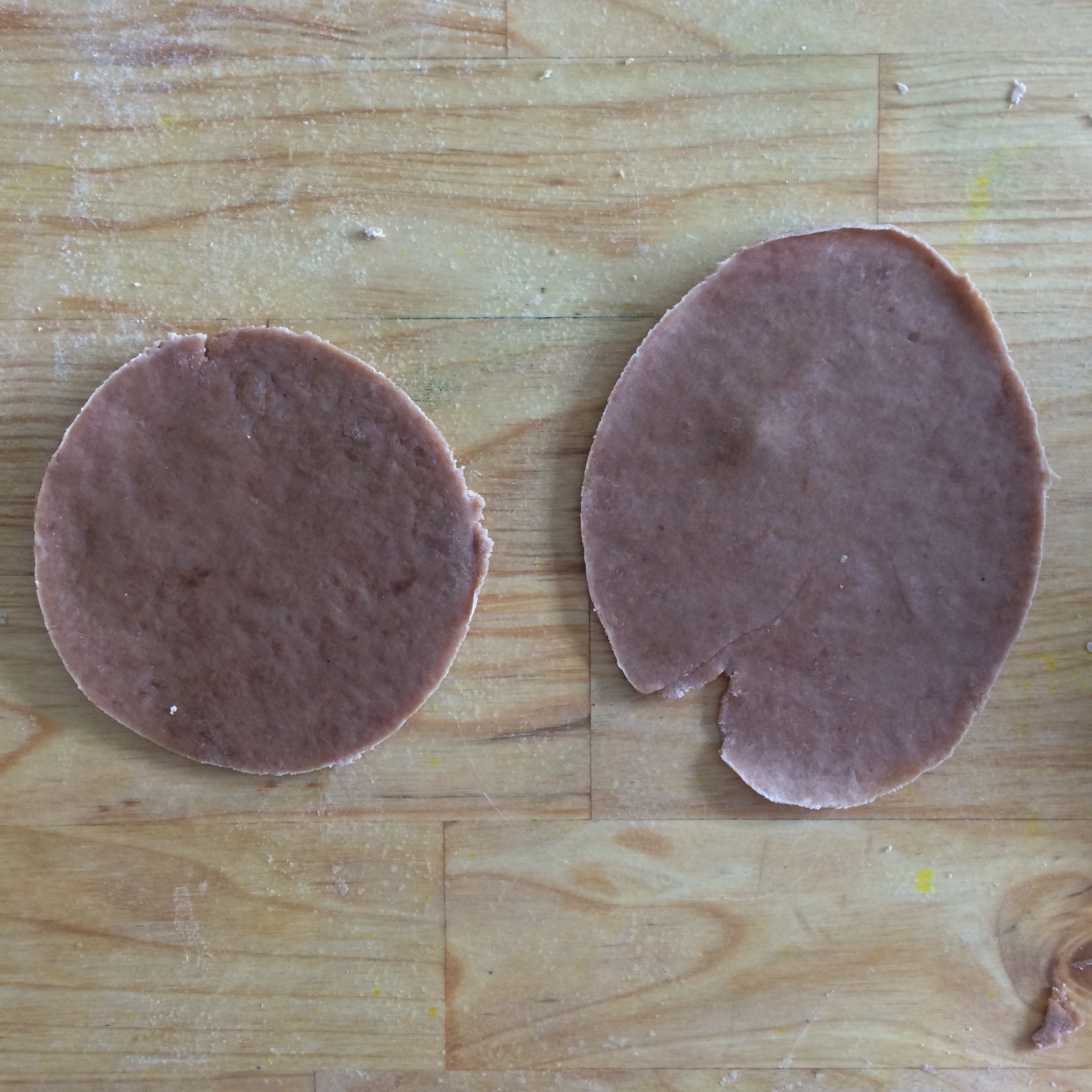 Cut dough into 4 pieces and roll each piece into a large, thin circle, about 1/16th of an inch thick. It will be very elastic, so you may have to let it rest periodically so it doesn’t keep snapping back. While rolling each piece, keep the other pieces wrapped in plastic. The edges should curl inward slightly.