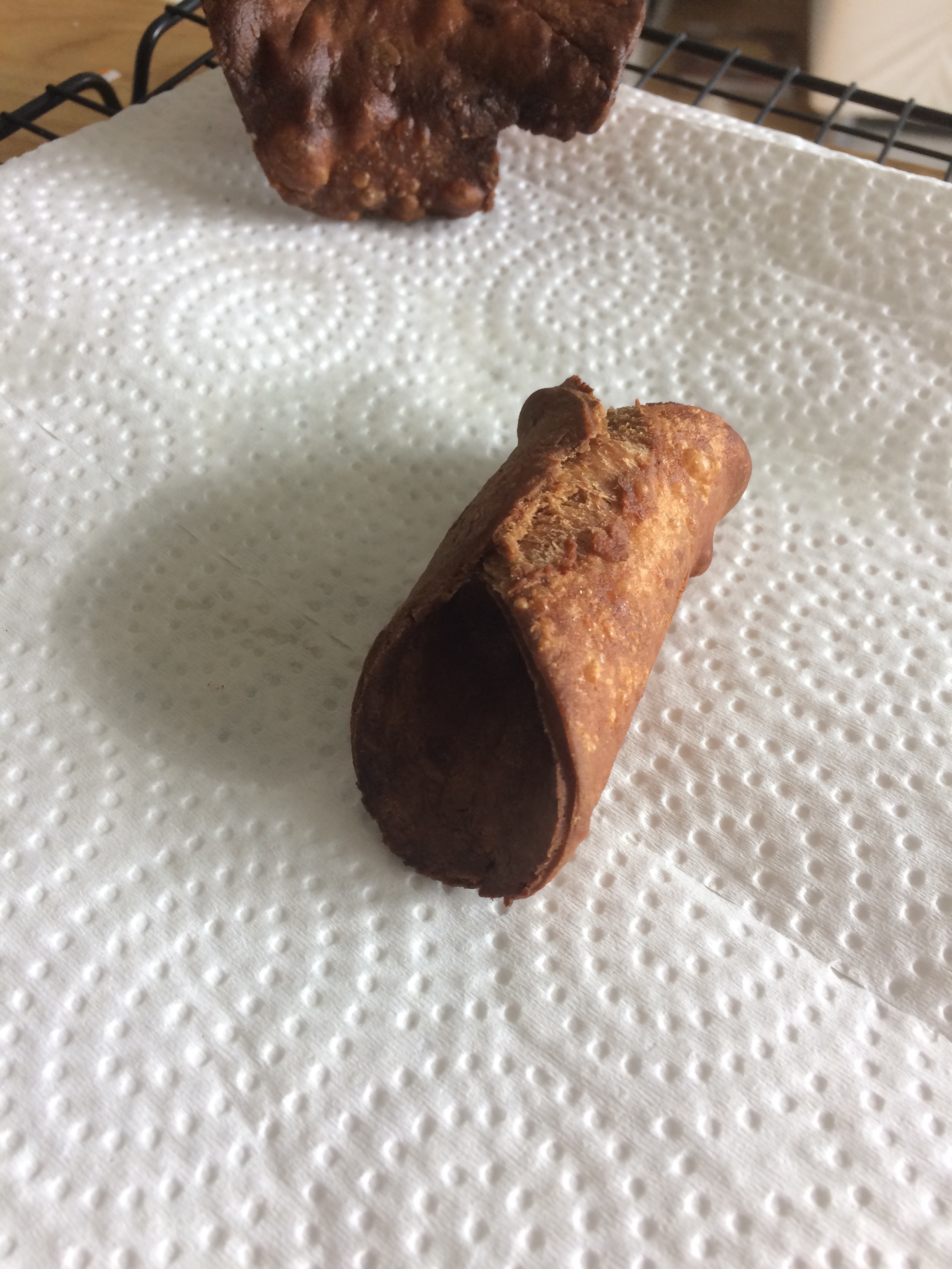 Gently slide the dough wrapped form into the hot oil and fry for about 30 seconds, moving around with tongs to ensure it evenly cooks. Remove the form from the oil with tongs and gently slide shell off with a knife, allowing to cook about 30 seconds more. It should be a couple of shades darker than when it went into the oil. Transfer shell to prepared baking sheet and repeat with remaining shells. Allow them to cool completely before filling.
