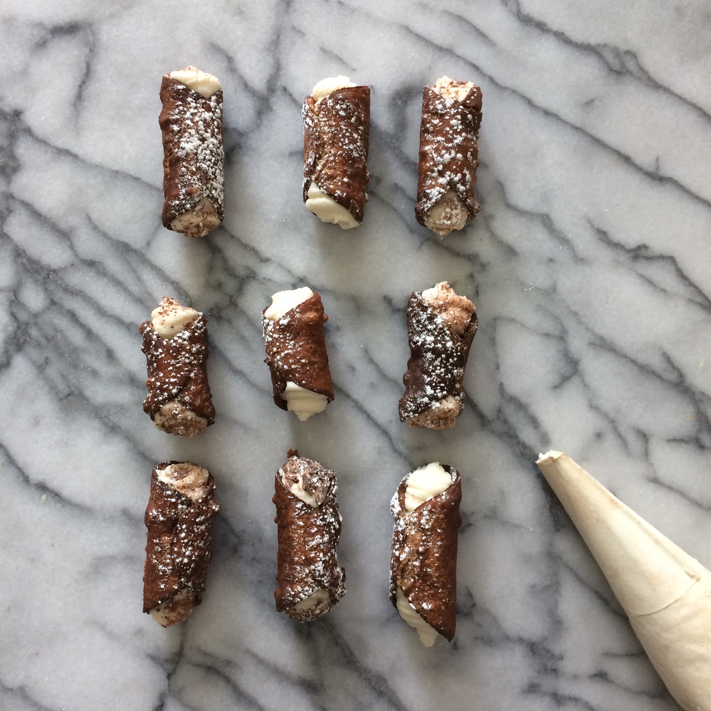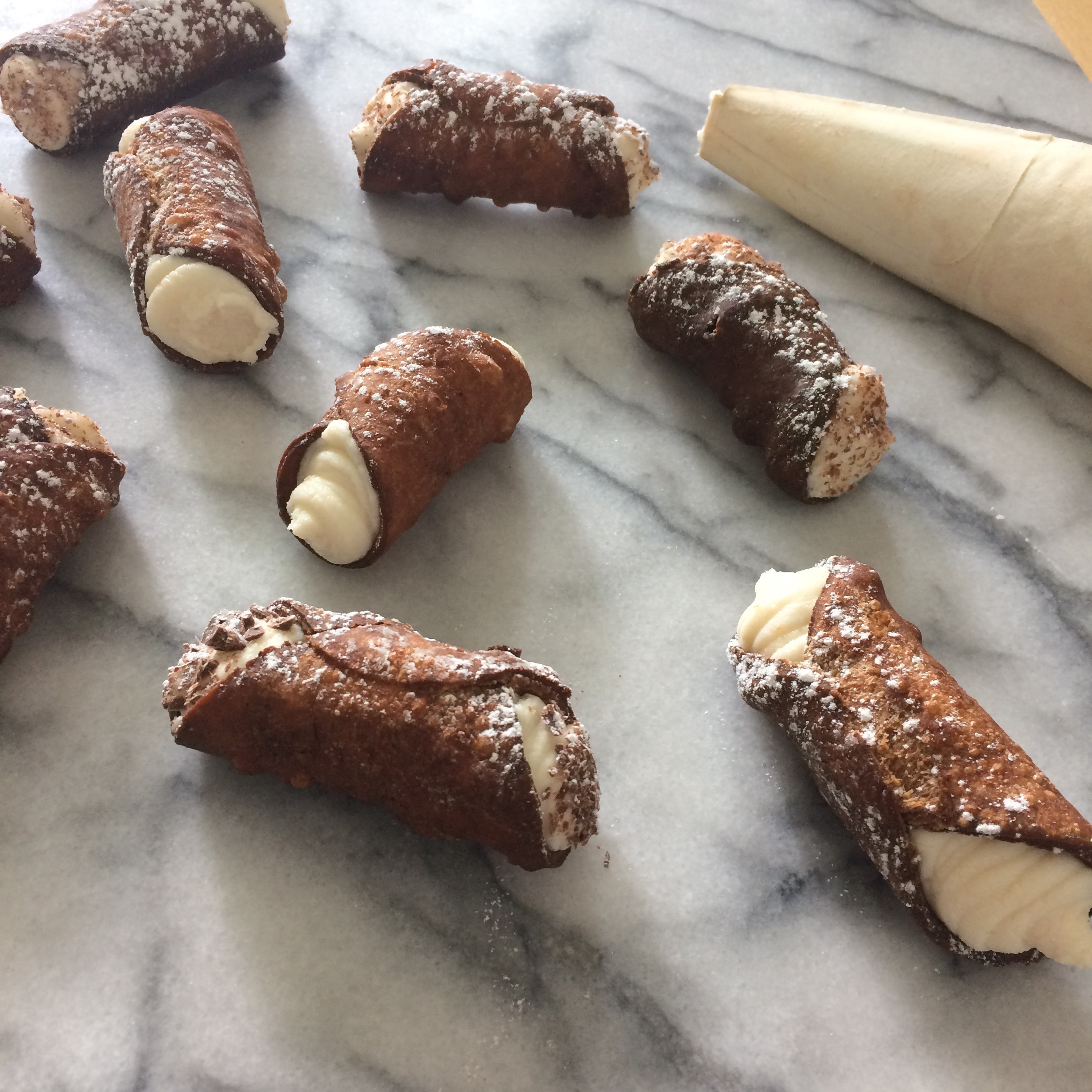 To make filling, mix ricotta, icing sugar and vanilla with a spatula until fully incorporated. If you like, fold mini chocolate chips into the filling. Using a pastry bag, pipe filling into shells from each end until completely filled. Dust generously with icing sugar and serve immediately after filling.