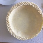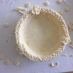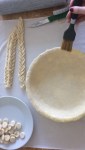 You’ll need about three of these braids for the whole crust rim.  Brush the rim of the dough in the pan with egg wash and set a braid on top, gently pressing down to set (I also lightly scored the rim of the pie shell to help the braid stick more).  You can connect each braid by the end pieces or cover the joints with dough cutouts.