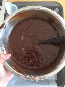 Add 3 eggs to chocolate mixture and whisk until combined. Add the remaining eggs and stir until incorporated. Add vanilla and stir until just incorporated, careful to not overmix (will otherwise be cakey texture).